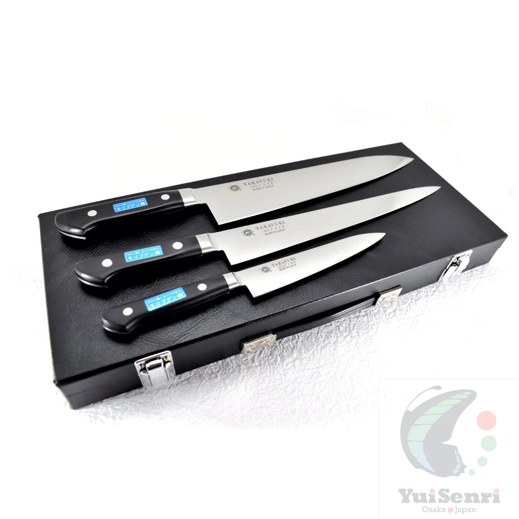 堺孝行製洋庖丁3点(イノックス 牛刀 270 mm、筋引 270 mm & ペティ 150 mm)に 3点用アタッシュが付属した便利なギフトセットです。