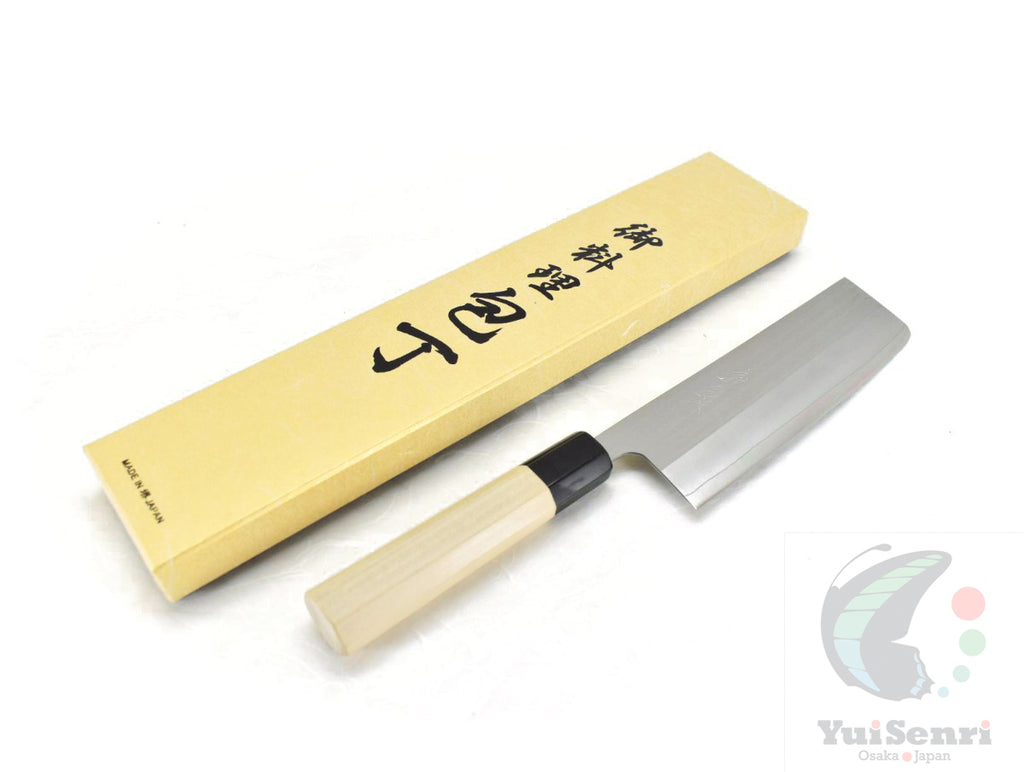 ステンレス製で、刃先に硬度の高いダイス鋼を割り込み、本職用に使用される水牛柄をつけたシンプルで機能性の高い逸品です。菜切(刃渡り160 mm)は根菜、青物、葉物を真っ直ぐにまな板に落とせる便利な庖丁です。ご家庭用にもプロ用にも活用できます。