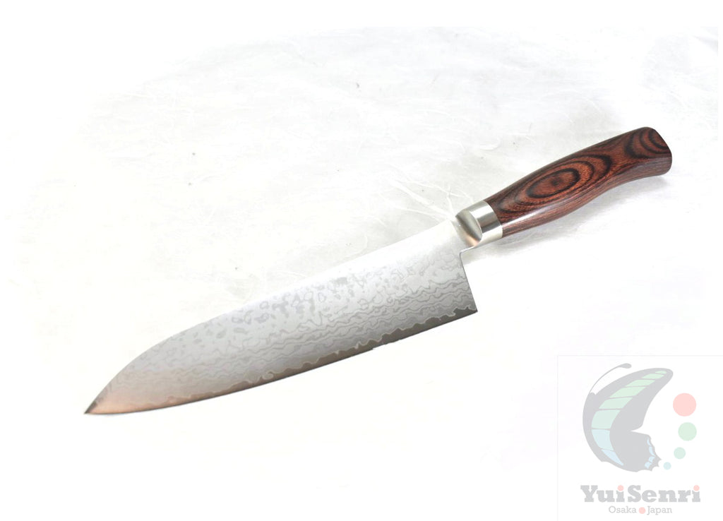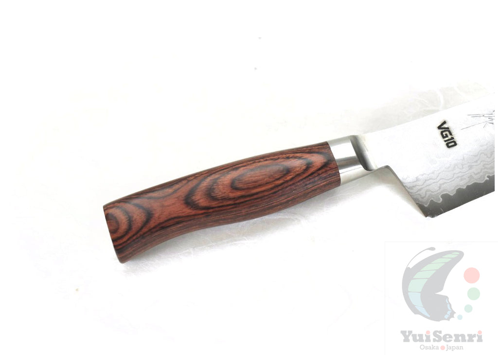 高級ステンレス刃物鋼の中でも人気の高いV金10号(VG10)をダマスカス軟鉄に割り込んだ使い勝手の良い三徳包丁です。 切れ刃部分をより薄口に仕上げ、切れ味と長切れ性能のバランスを図っています。 ハンドルは手になじむように新たな型を採用し、口金は高級感の漂う溶接磨きで仕上げました。