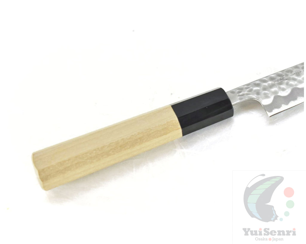 唯千里 オリジナルの《青紙スーパー鎚目》モデルです。鋼材として有名な青紙スーパーを芯材にステンレス鋼を割り込み、刃の表面を鎚目仕上を施し、本職用の水牛八角柄を合わせた高級感ある逸品です。鋭い切れ味と共に、切味が長く保てるのが特徴です。